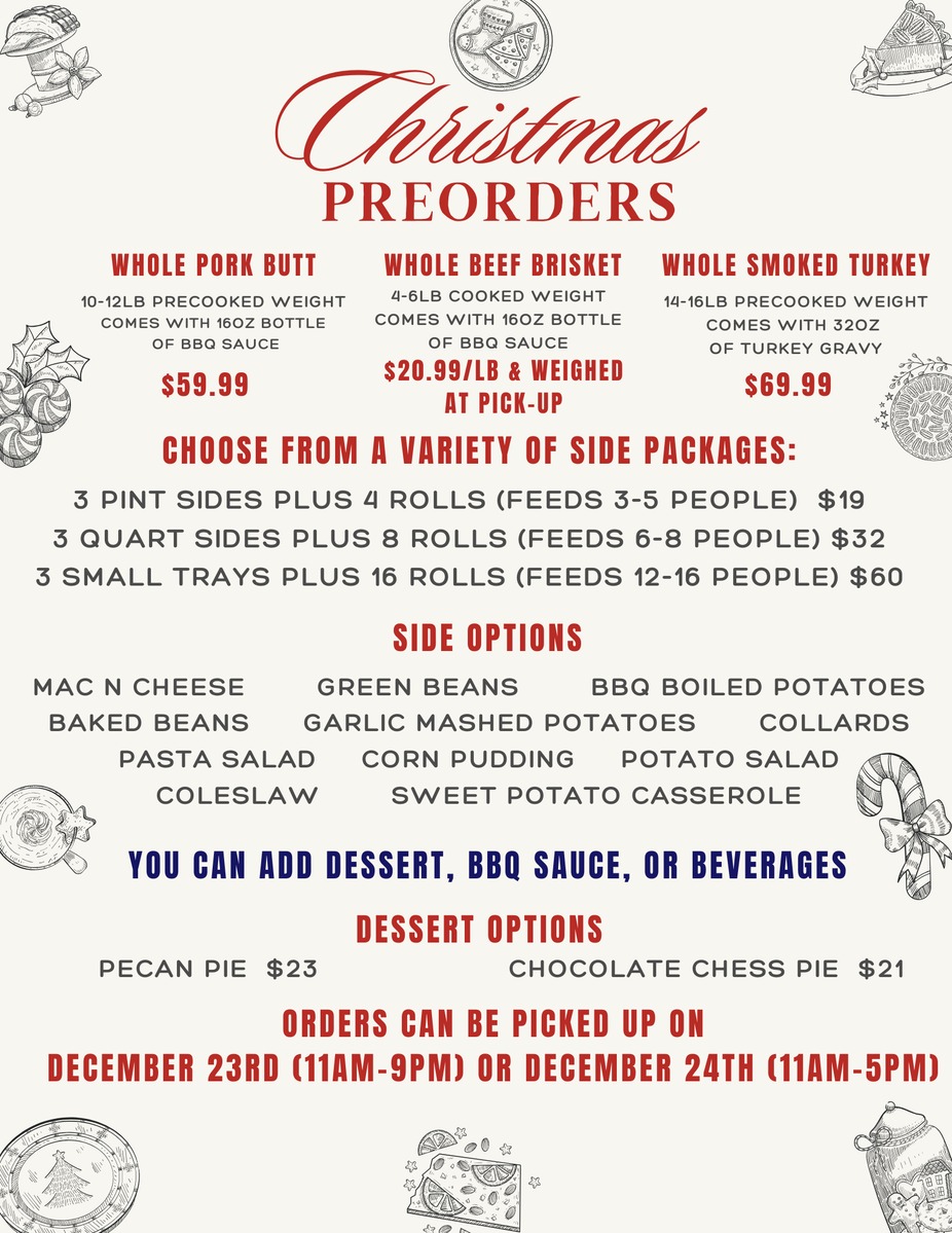 Happy Holidays to all of our fans! Our preorders are open. Place your order for pickup on Christmas Eve between 11am and 5pm! We would love to help feed your family this Christmas!